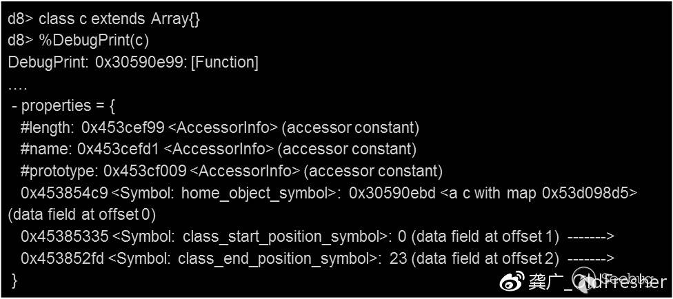 現在我們有了將對象的可枚舉私有屬性重賦值的能力,為了利用這種能力,我遍歷了 v8 中所有的私有符號[5],嘗試給以這些私有符號為鍵的私有屬性重新賦值,希望能能攪亂 v8 引擎的內部執行流程,令人失望的是我并沒有多大收獲,不過有兩個私有符號引起了我的注意,它們是 class_start_position_symbol 和 class_end_position_symbol ,從這兩個符號的前綴我們猜測這兩個私有符號可能與 JavaScript 中的 class 有關。于是我們定義了一個 class 來觀察它的所有屬性。