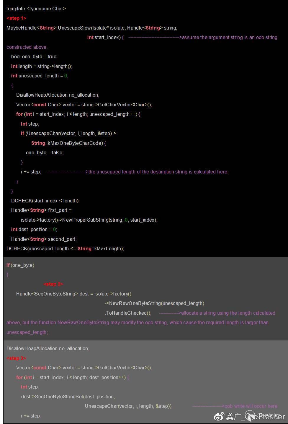 在 Object.assign 的快速通道的實現中,首先會判斷當前賦值是否滿足走快速通道的條件,如果不滿足,則直接返回失敗走慢速通道,如果滿足則會簡單的將源對象的所有屬性都賦給目標對象,并沒有過濾那些鍵是私有符號并且具有可枚舉特性的屬性。如果目標對象也具有相同的私有屬性,則會造成私有屬性重新賦值。這就是本文要討論的邏輯錯誤。Google 對這個錯誤的修復很簡單[4],給對象增加任何屬性時,如果此屬性是私有屬性,則給此屬性增加不可枚舉特性。現在蝴蝶已經找到了,那它如何扇動翅膀可以實現遠程任意代碼執行呢,我們從第一扇開始,將邏輯錯誤轉化為越界讀漏洞。
