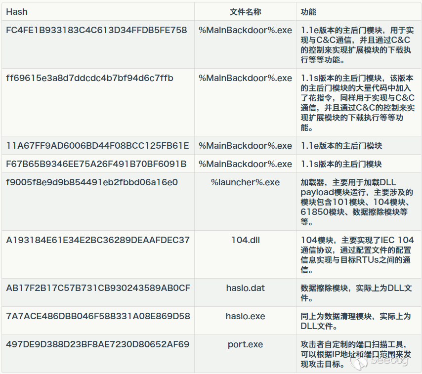 Industroyer 惡意軟件是由一系列的攻擊模塊組成,根據目前所公開的信息及 ESET 得到的模塊就多達10多個。其中存在一個主后門模塊,它被用于連接C&C下載另外一批模塊執行,這些模塊分別為:實現 DLL Payload 模塊執行的加載器模塊、實現數據及痕跡清理的 haslo 模塊、實現IP端口掃描的 port 模塊以及實現西門子 SIPROTEC 設備 DoS 攻擊的 DoS 攻擊模塊。其中,DLL Payload 模塊包含實現 IEC 101 工控協議的 101.dll 模塊、實現 IEC 104 工控協議的 104.dll 模塊、實現 IEC 61850 協議的61850.dll/61850.exe 模塊以及實現 OPC DA 協議的 OPC.exe/OPCClientDemo.dll 模塊等。以下我們列出了可以收到的樣本及其功能。