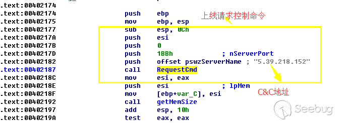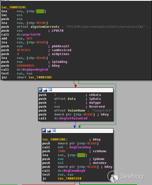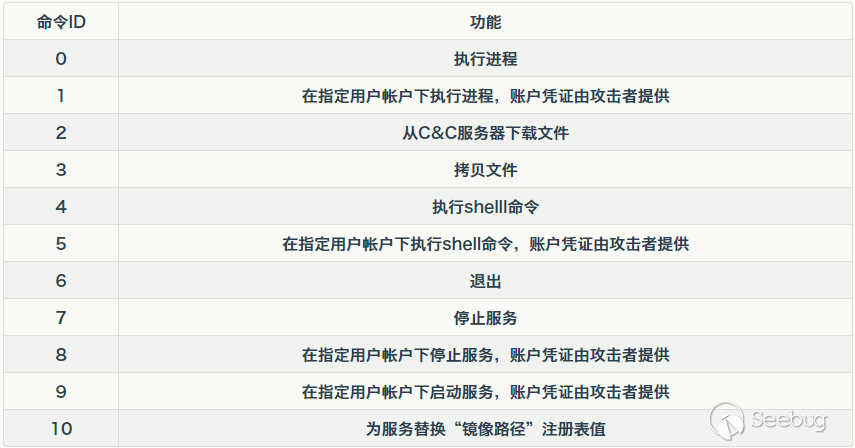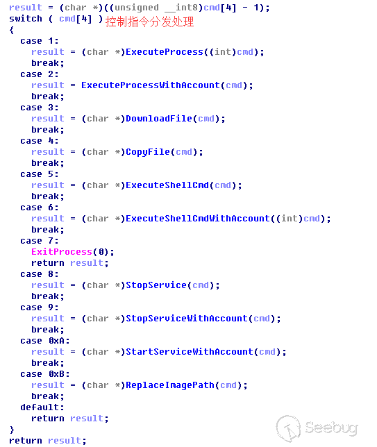 從控制功能上可以看出該后門模塊的主要任務是從C&C下載擴展模塊執行以及做遠程命令執行,并且提供了由賬戶憑證支持的權限控制。如果黑客獲取了管理員權限就可以將已安裝的后門升級到一個更高的權限版本,黑客可以選擇一個現有的、非關鍵的 Windows 服務,在注冊表中替換它的 ImagePath 鍵值為新后門的代碼路徑。