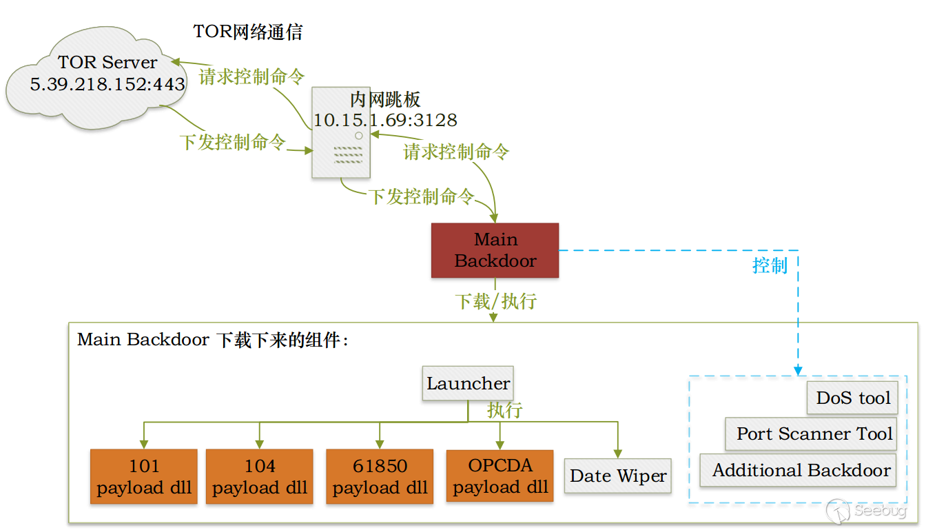 值得注意的是,Main Backdoor 與 C&C 通信的時候是通過內網中的一臺主機作為跳板連接到 C&C 上實施命令控制的,ESET 發現該模塊是通過 Tor 網絡實現與 C&C 的交互。因此根據目前所掌握的信息我們繪制了該惡意軟件大致工作流程。