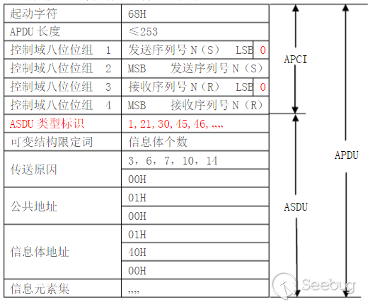 I格式幀常常包含 APCI 和 ASDU 兩個部分,其控制域第一個八位組的比特1=0,I幀包含特定信息,類型和內容較多。