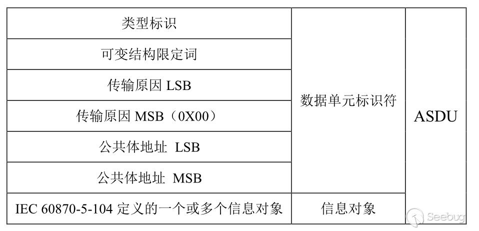 應用服務數據單元(ASDU)由數據單元標識符和一個或多個信息對象組成。類型標識定義了后續信息對象的結構、類型和格式。可變結構限定詞定義了信息元素的數目和信息體地址類型,長度為一個字節。公共體地址即為 RTU 地址,長度2個字節,低位在前。