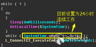 該模塊的通信部分也是通過一個小時為單位的時間定制化任務來執行。也就是說,在黑客實時攻擊過程中也是有可能的通過這個定制化功能在指定的時間里與 C&C 通信,比如深夜時間。如下圖: