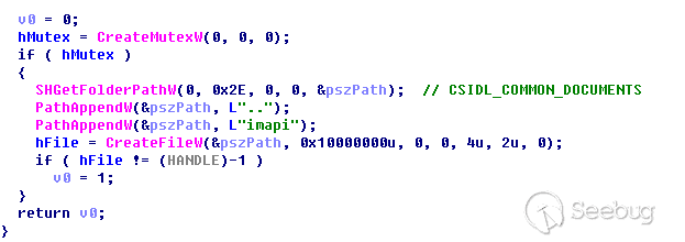 此外,該模塊會創建一個匿名的互斥體,并且會在路徑 %Common Documents% 的父目錄創建一個標識文件 imapi ,只有這個文件存在的情況下才會執行與 C&C 通信的任務。