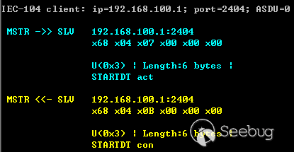 執行完以上操作后,該模塊會根據 IEC-104 規約構造數據包向配置文件中指定的目標主機IP端口發送啟動幀。構造啟動幀數據包代碼如下: