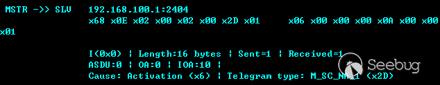 當前類型標識為0x2d傳輸原因為0x06表示主站發送單點遙控,其中遙控性質為0x81表示向從站發送單點遙控選擇