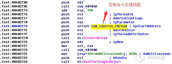 該后門收到控制命令數據后,會對數據做一定處理,最后創建一個線程來處理黑客端發來的控制請求。