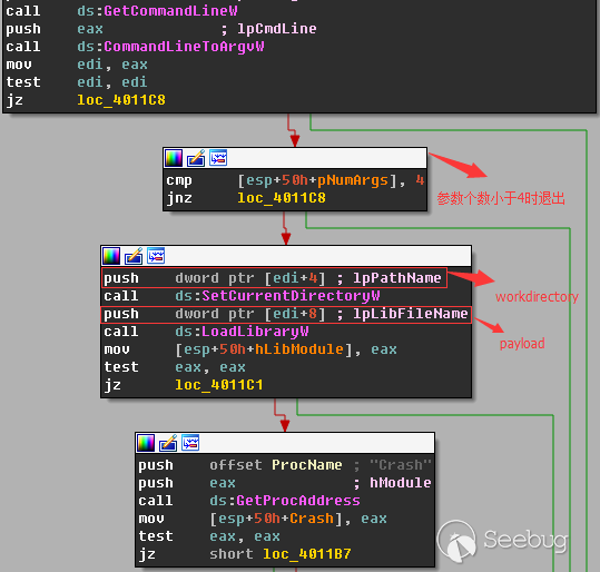 當模塊啟動運行時會將 workdirectory 設置為當前目錄,然后加載 payload 模塊。需要注意的是,此時加載 Payload 模塊但是并沒有執行模塊的核心功能,這些功能實現在 Payload 模塊的導出函數 Crash() 中,所以通過該 Launcher 運行的 Payload 模塊都必須導出這么一個函數。