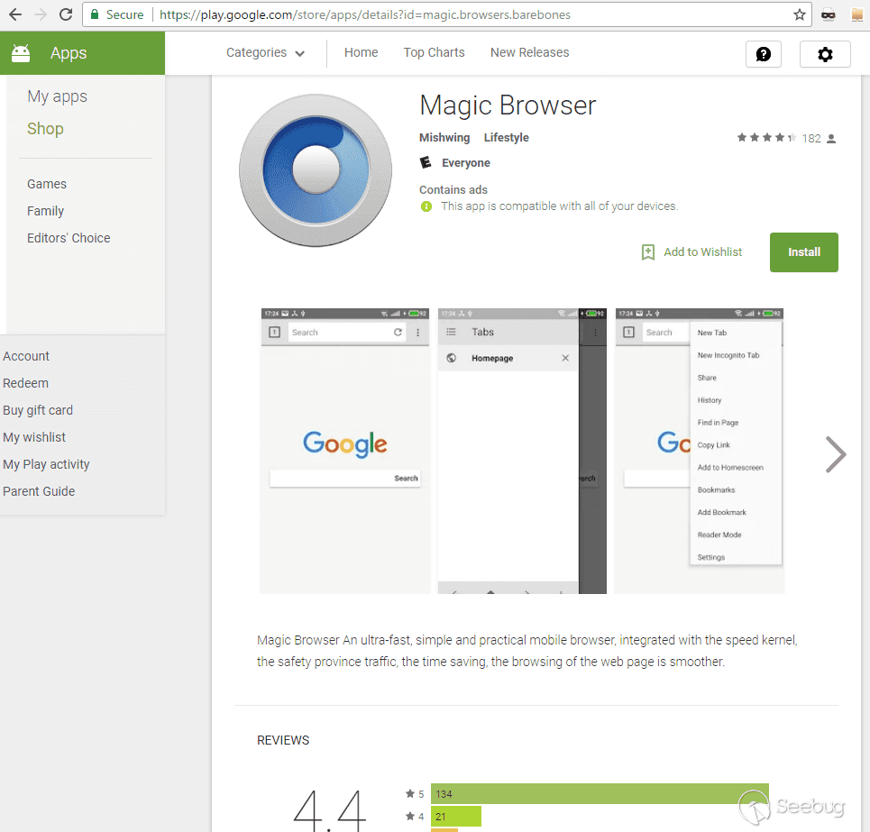 第一款惡意軟件,應用名為 “Magic browser” 的軟件,于2017年5月15號上傳到 Google 商店,安裝次數超過5萬次。