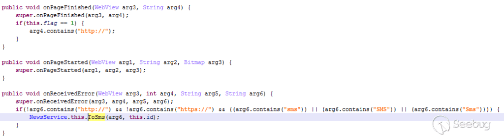 針對這些請求,木馬可能會收到一些加密的 JSON 文件,其中包含一些數據。此數據應包括 offer 列表,每個 offer 均包含一個名為 “url” 的字符串字段,可能含有或不包含實際的網址。木馬將嘗試使用自己的類打開/查看該字段。如果這個值確實是一個 url,那么木馬會向用戶顯示其內容。但是如果它是別的東西,并帶有一個 “SMS” 子串,用戶將發送包含提供給該數字的文本的 SMS 。