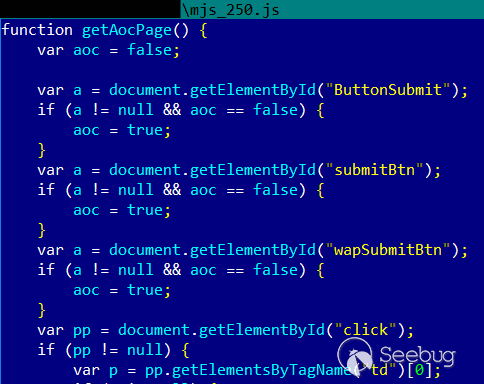 我使用不同的 MCC 下載了幾個 JS 文件,來了解這些網絡犯罪分子對來自不同國家的用戶做些什么。我無法得到一個美國 MCC 的文件,但對于其他我試用過的國家,我收到了一些具有一些功能的文件。所有的文件都包含一個名為 “getAocPage” 的函數,它最有可能引用 AoC - 付費建議。