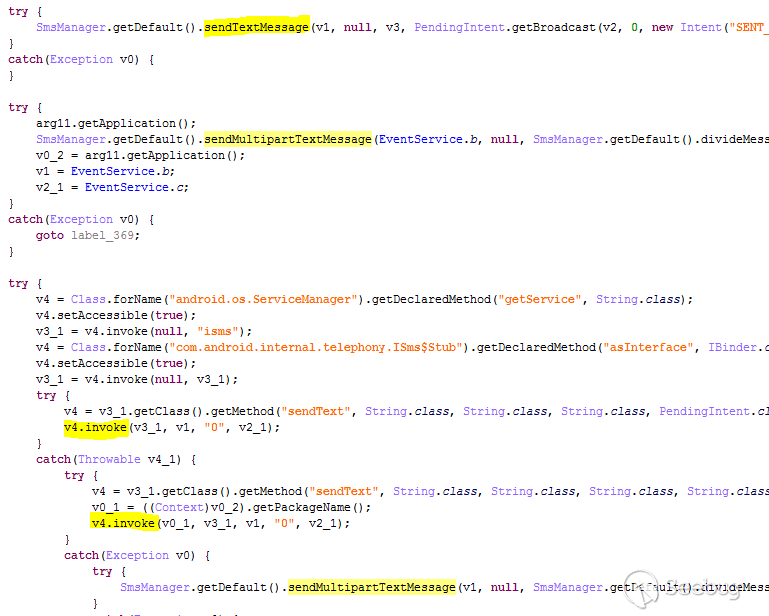 所有這些木馬,包括來自 Google Play 的木馬,都在試圖從設備發送短信。為了做到這一點,他們正在使用大量方法來發送短信: