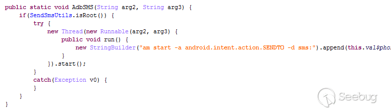 總而言之,“Magic browser” 應用程序試圖利用其代碼中11個不同的地方發送短信。網絡犯罪分子這樣做是為了能夠從不同的 Android 版本和設備發送 SMS 。此外,我還能找到另一種 Trojan-SMS.AndroidOS.Ztorg 的修改版本,它試圖通過 “am” 命令發送 SMS ,盡管這種方法不行。