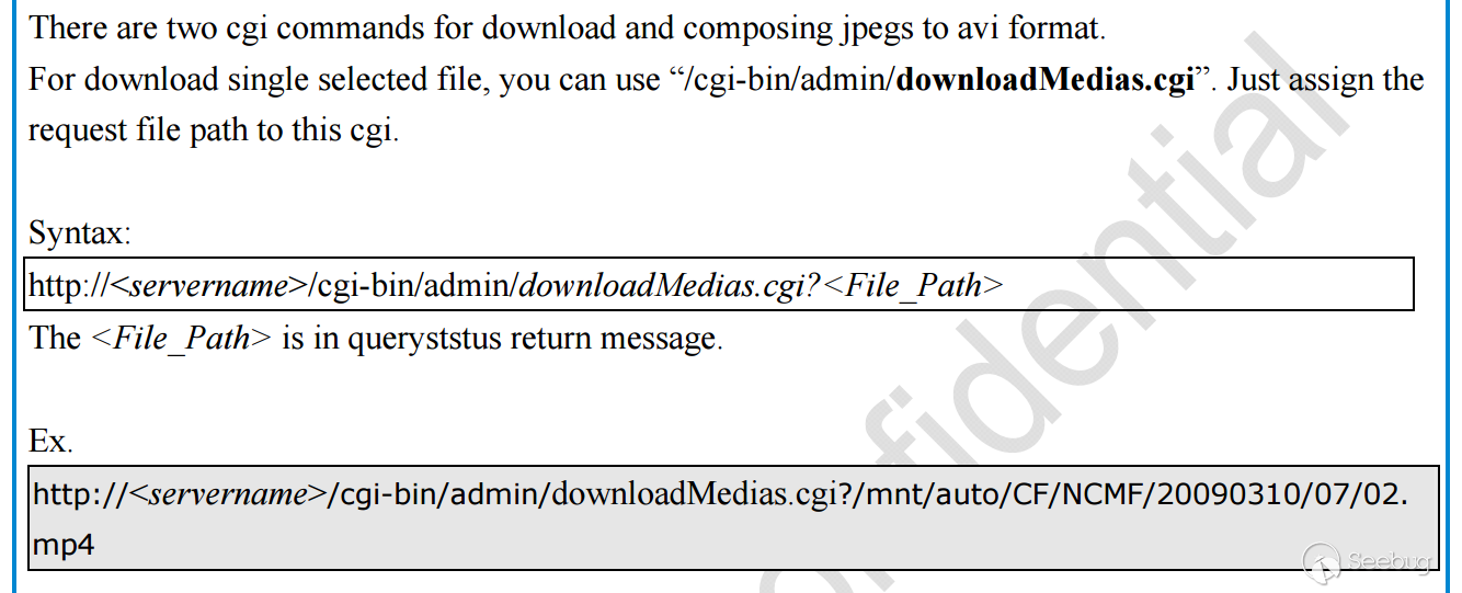 于是對 Web 服務進行黑盒測試,然而并沒有發現什么漏洞。訪問 /cgi-bin/viewer/getparam_cache.cgi?system_info_firmwareversion 得知固件版本號是 IB8369-VVTK-0102a ,那么型號應該就是 IB8369 了。去官網下載固件進行分析,順手點開了固件旁邊的用戶指南,在一堆 cgi 接口中發現了這么一條: