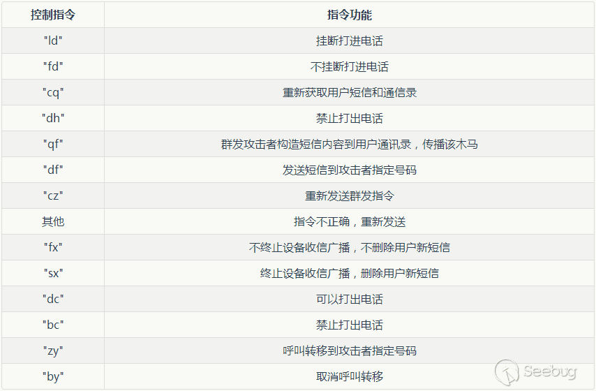 該惡意樣本利用短信收發廣播和觀察者模式兩種方式來監聽感染設備的新收短信。如果新收短信來自攻擊者,則執行相應控制命令(其中包括短信群發到感染設備通訊錄完成傳播和控制感染設備來電去電等功能,詳細的控制指令和對應功能見下表)。否則,竊取其他新收短信(分別通過郵件和短信方式發送)。見下圖: