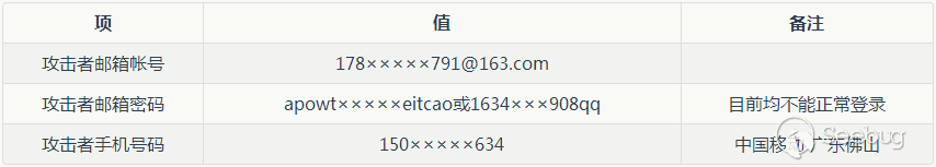 攻擊者的郵箱帳號和密碼以及手機號碼見下表,目前該郵箱賬戶不能正常登錄,應該是攻擊者修改了郵箱密碼。