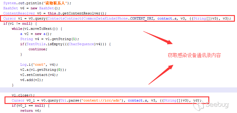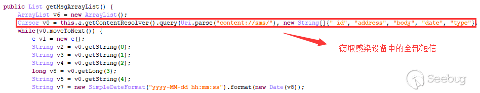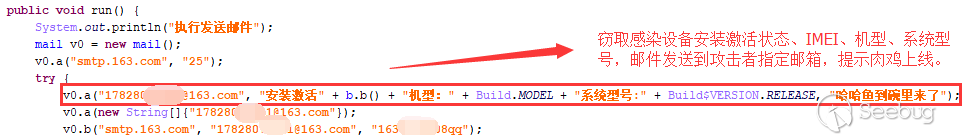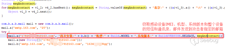 竊取感染設備IMEI、機型、系統版本和整個設備的短信和通訊錄,郵件發送到攻擊者指定的郵箱: