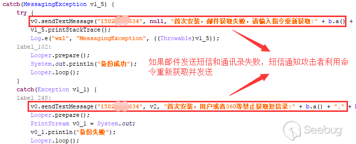 如果通過郵件上傳用戶的短信和通訊錄時報錯,則會以短信的方式通知攻擊者利用控制命令重新獲取短信和通訊錄并發送: