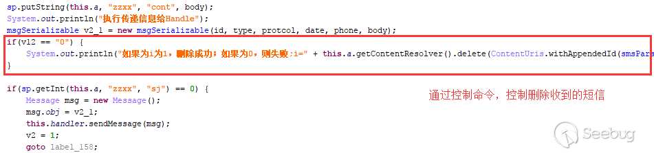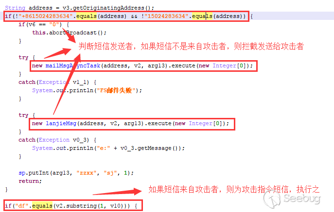 判斷短信發送者,如果不是來自攻擊者,則將截獲的短信分別發送到攻擊者指定的163郵箱和以短信的形式發送給攻擊者指定的手機號碼;如果新收短信來自攻擊者,則執行對應控制命令(其中包括短信群發到感染設備通訊錄完成傳播和控制感染設備來電去電等功能)。