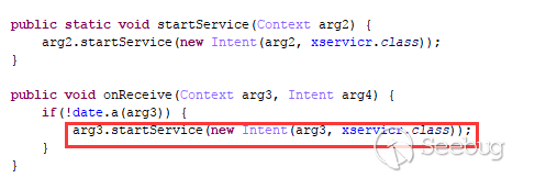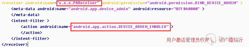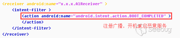 該惡意木馬還定義了廣播接收器,用于自啟動。當用戶手機重啟時,啟動惡意服務,繼續其侵害過程。