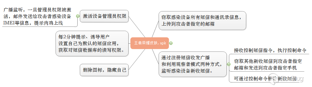 我們所分析的這款惡意木馬偽裝成“王者榮耀皮膚”應用以吸引用戶下載安裝(見下圖)。運行后,該惡意木馬會首先啟動設備管理器界面,引導用戶激活自己為設備管理員,這樣可以避免被輕易卸載。設備管理員權限一旦被激活,該惡意木馬便會將竊取到的感染設備安裝激活狀態、IMEI、機型、系統型號等信息以郵件的方式發送到攻擊者指定的163郵箱,提示肉雞上線。其次,該惡意木馬還會每隔2分鐘提示、誘導用戶設置自己為默認的短信應用,以獲取對短信數據庫的讀寫權限。最后,惡意木馬會刪除圖標,隱藏自身。