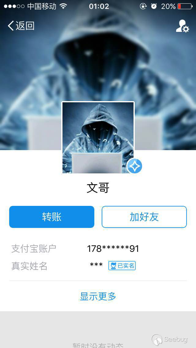 再通過該手機號碼,分別查到與之相關聯的微信賬戶和支付寶賬戶(見下圖),我們驚喜地發現其賬戶頭像和該惡意木馬圖標一致。所以該手機號碼和以下賬戶和該惡意樣本有強關聯,此人很有可能是該惡意木馬控制背后的黑客。