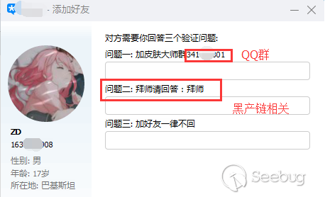 另外,通過樣本中暴露的黑客回傳郵箱的密碼來看,發現其中一個密碼是一個QQ號碼。并且通過加該QQ號可以看出與其相關聯的QQ賬信息,如下圖,并且從驗證問題中的“拜師”可以看出,該黑客還在接收徒弟,做黑產技術培訓。