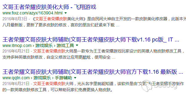 綜合以上線索,我們以“文哥”、“王者榮耀”、“皮膚大師”等作為關鍵字,通過搜索發現網上存在很多由該攻擊開發的相關工具,通過我們下載確認其中很多工具中存在惡意行為。搜索結果如下: