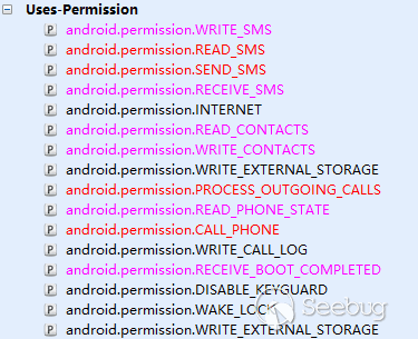 該惡意木馬申請的權限如下圖所示,其中,涉及到的敏感權限包括短信的讀、寫、發送權限,聯系人讀寫權限,打電話權限,自啟動權限和監聽、控制、取消呼出電話的權限等。