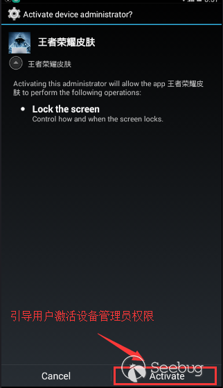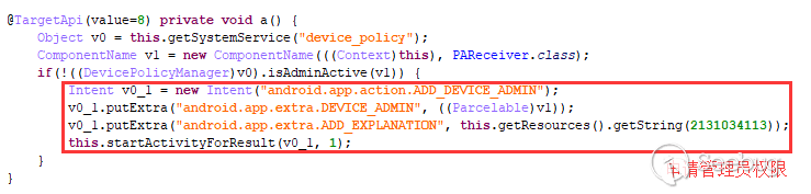 該惡意樣本首先會啟動設備管理器界面,引導用戶激活自己為設備管理器,這樣可以避免自己被輕易卸載。見下圖: