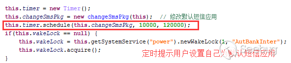 該惡意木馬每隔2分鐘提示、引導用戶設置自己為系統短信應用,接管短信服務,以獲得對短信數據庫的操作權限(見下圖)。