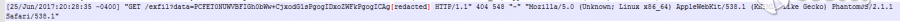 [25/Jun/2017:20:31:49 -0400] "GET /ssrftest HTTP/1.1" 404 548 "-" "Mozilla/5.0 (Unknown; Linux x86_64) AppleWebKit/538.1 (KHTML, like Gecko) PhantomJS/2.1.1 Safari/538.1"