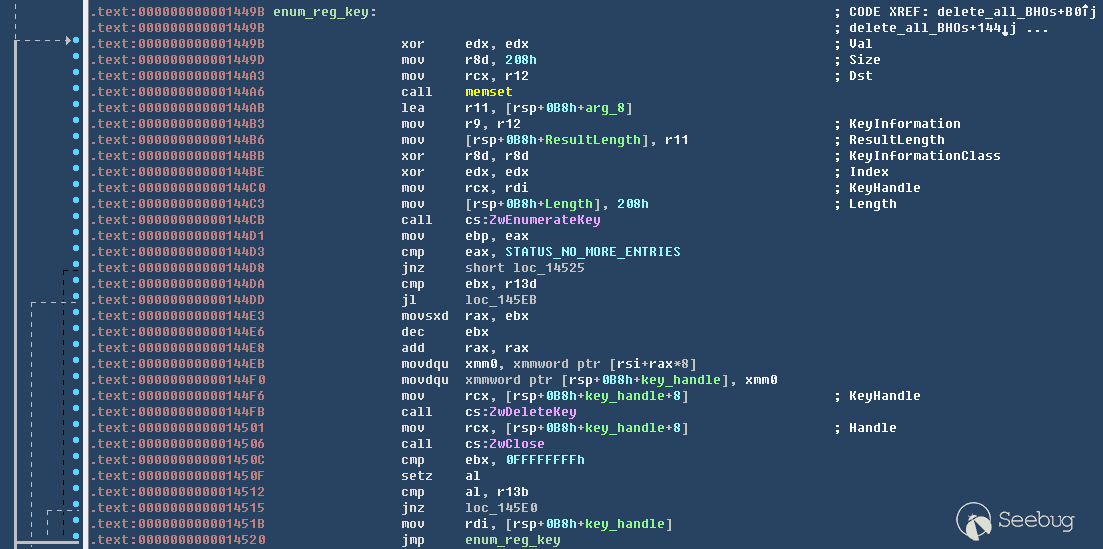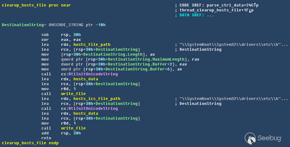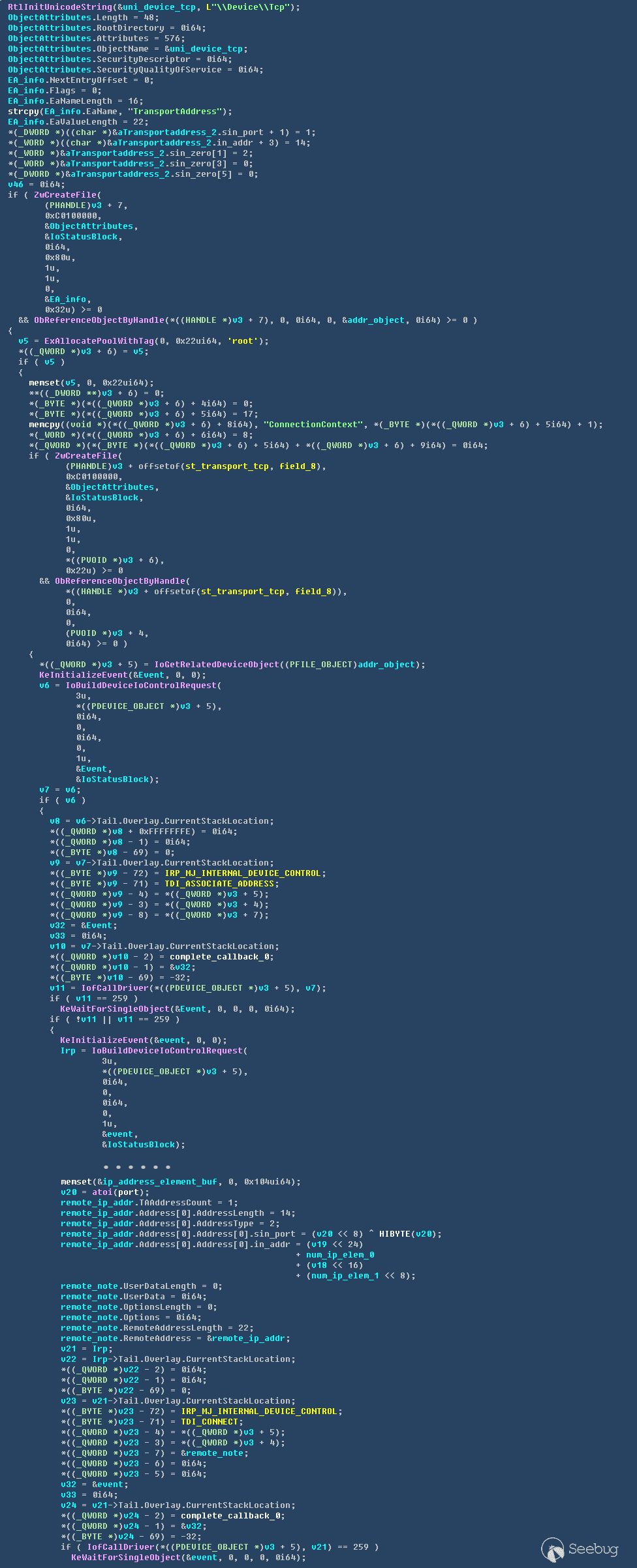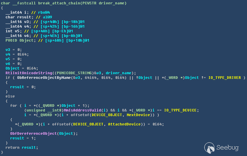 除了刪除驅動回調外,該病毒還會通過截斷 attach 到 tcpip、AFD、tdx 驅動上設備鏈的方式,排除網絡過濾驅動對其流量劫持效果的影響。如下圖所示: