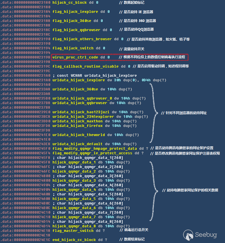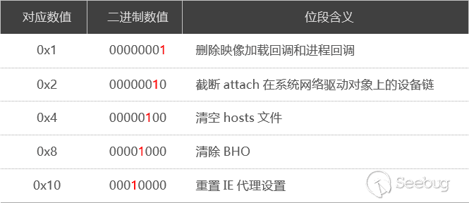上圖中所示紅框所標注出的變量 virus_proc_ctrl_code 可以控制病毒的執行執行的對抗操作流程,其所能控制的對抗操作例如:刪除其他驅動的映像加載回調和進程回調、截斷 attach 在系統網絡驅動上的設備鏈等。因為絕大部分瀏覽器首頁保護和首頁劫持都會在這些位置上做文章,所以在病毒在劫持流量的同時進行上述對抗可以一定程度上提高其劫持成功率。該變量以位段的形式規定執行流程,各個位段含義如下圖所示: