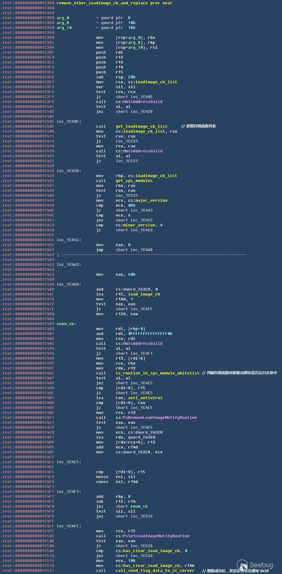 這種方法主要針對利用進程回調和映像加載回調相互配合劫持或保護瀏覽器啟動參數的情況,病毒先通過搜索代碼的方式在設置回調的系統函數中找到回調函數表,之后判斷回調函數所屬驅動模塊是否在白名單中,如果不在白名單中則執行刪除操作,刪除成功后想服務器發送運行狀態通知 0x10。如下圖所示:
