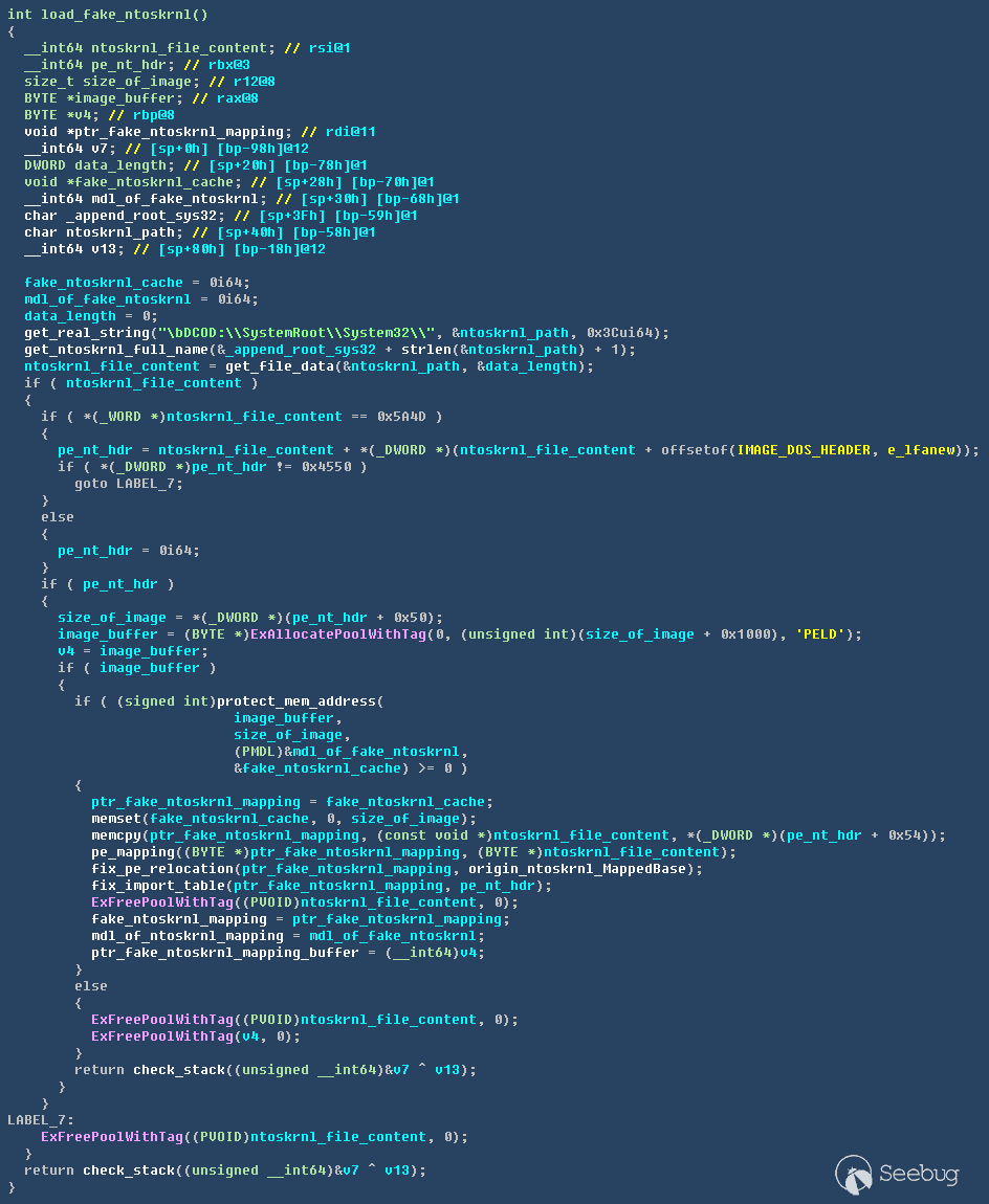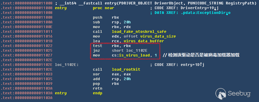 該部分代碼主要用于對抗安全軟件查殺和進行內核對抗。加載器功能代碼分為兩個部分,先會在內存中通過虛擬映射加載一個新的 ntoskrnl 鏡像,再通過相同的方式將真正的病毒驅動加載到內存中,并且將導入的 ntoskrnl 中的函數地址指向其虛擬加載的 ntoskrnl 鏡像中的函數地址上,通過此方法可以繞過其他驅動在 ntoskrnl 中設置的內核鉤子。全局變量 is_virus_load 是一個標記,通過傳入驅動主函數中的 RegistryPath 參數是否為 NULL 判斷是否為病毒通過虛擬映射方式加載。如下圖所示: