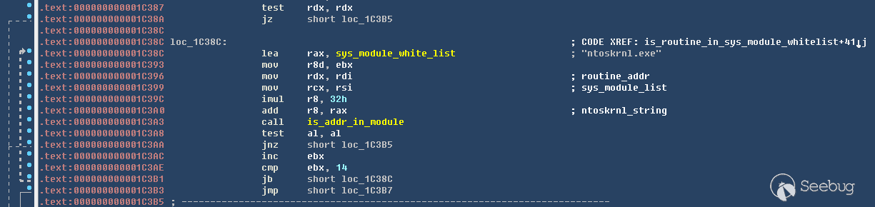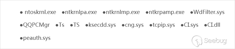 白名單中所存放字符串可以是文件名也可以是部分文件名,其中除了一些系統驅動模塊外還包括騰訊電腦管家相關驅動,因為騰訊電腦管家驅動全部包含 QQPCMgr、Ts 和 TS 字符串,所以騰訊電腦管家的全部驅動都會被放過。白名單列表如下圖所示: