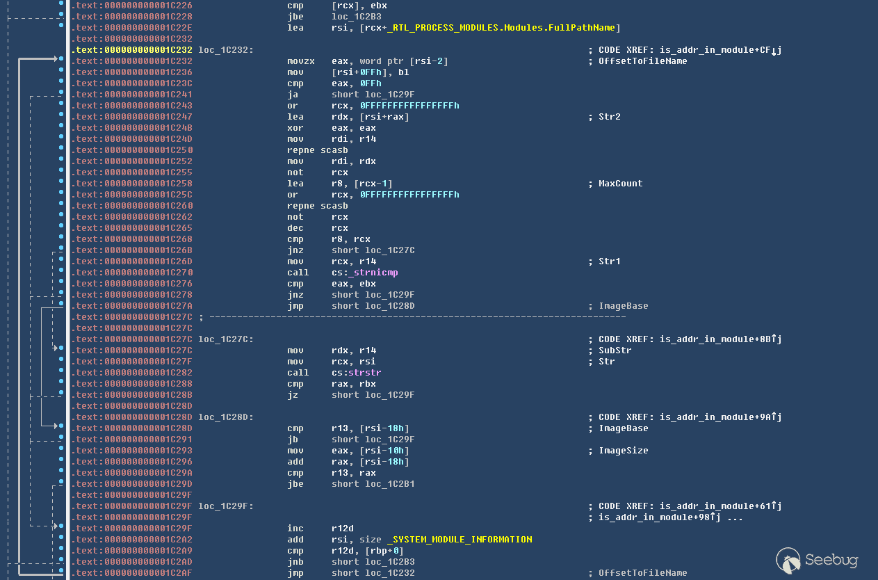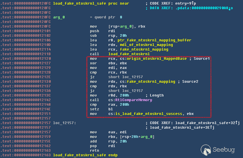load_fake_ntoskrnl_safe 函數會通過虛擬加載新的 ntoskrnl 鏡像,在其執行完虛擬加載邏輯之后,會與當前內存中系統加載的 ntoskrnl 模塊前 0x200 個字節數據進行比較,從而判斷自己創建的 ntoskrnl 鏡像內容是否正常。如下圖所示: