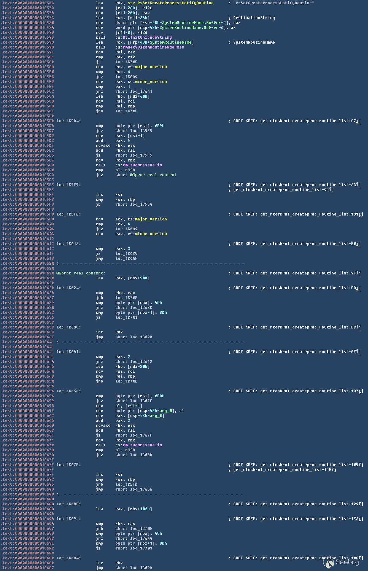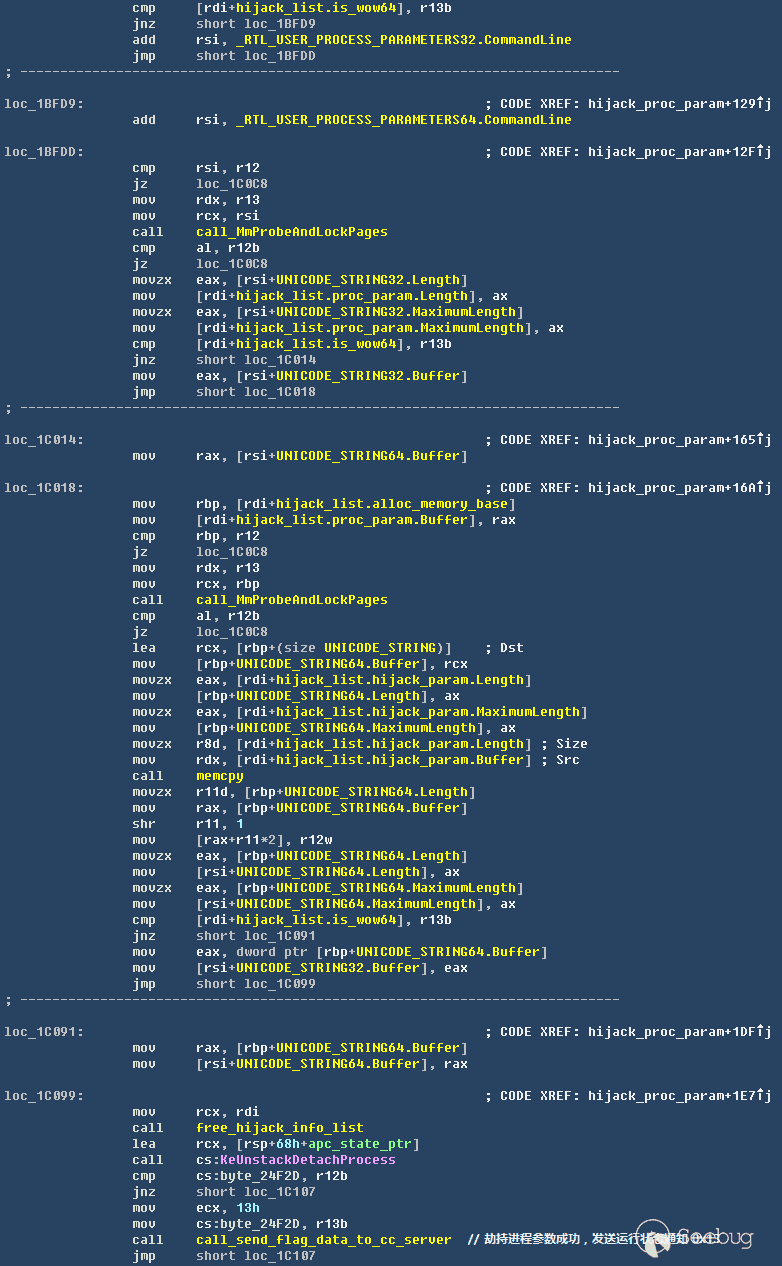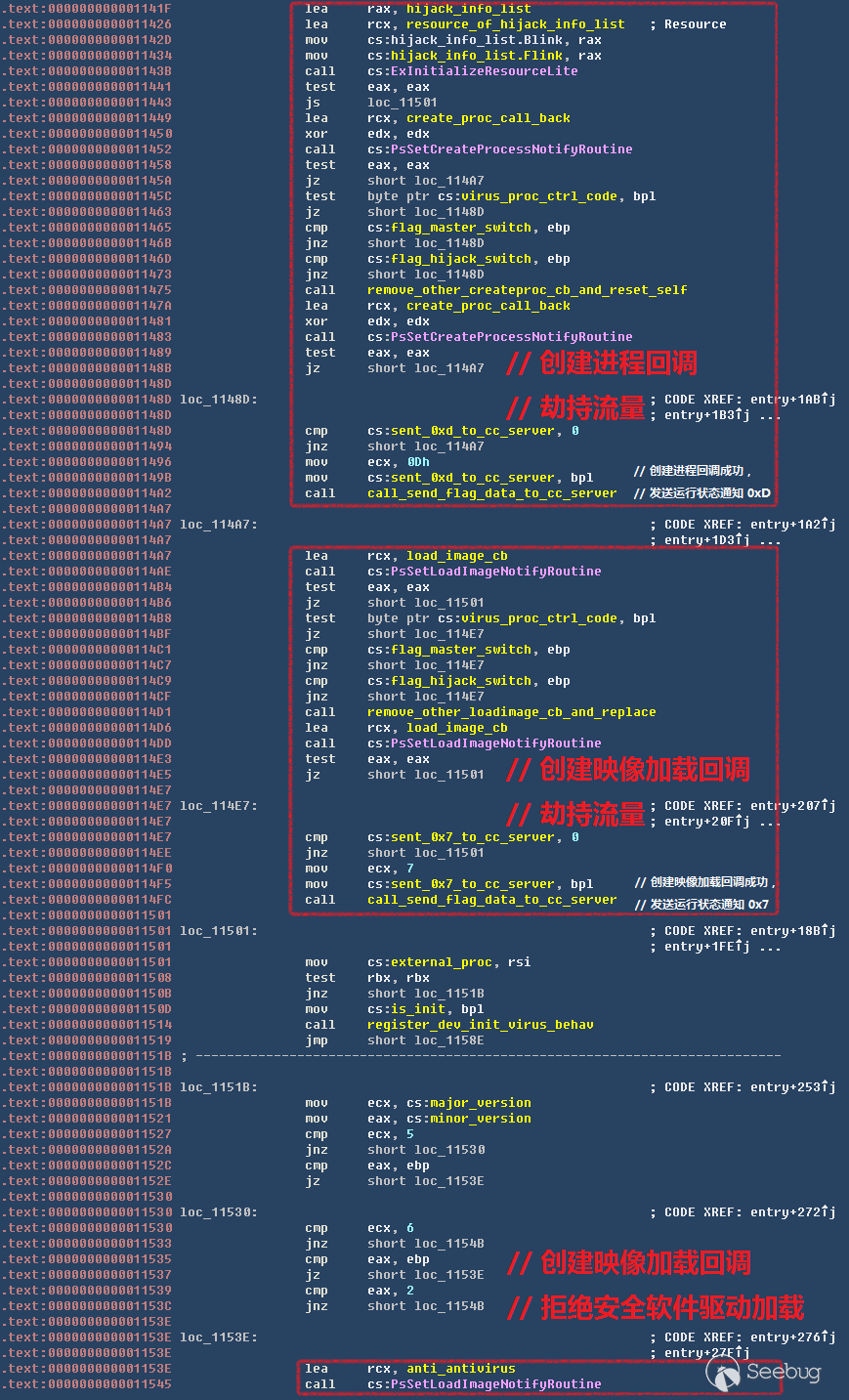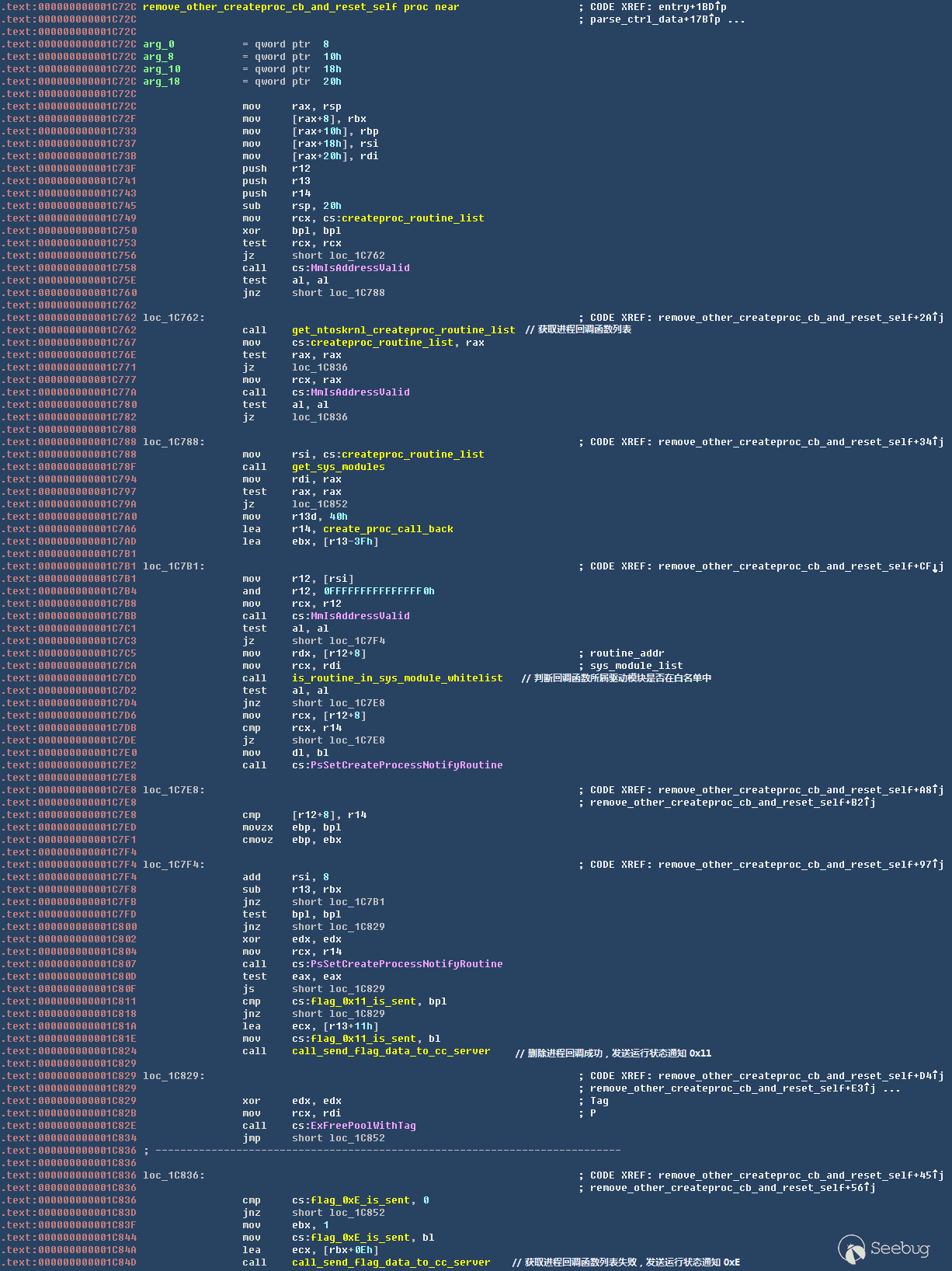 刪除進程回調的方法與刪除映像加載回調方法類似。如果執行中無法得到進程回調函數表則向C&C服務器發送控制碼 0xE,如果成功注冊進程回調函數則向 C&C 服務器發送 0x11。如下圖所示: