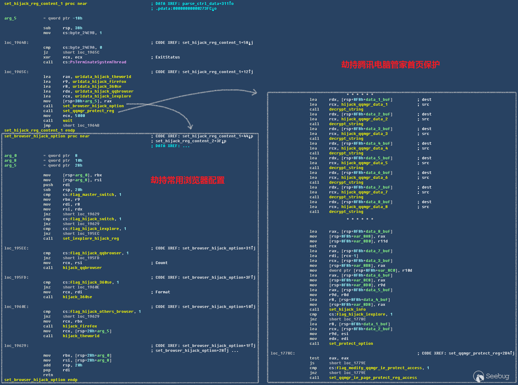 通過上述控制命令,我們可以直觀的看到,該病毒不但可以根據遠程獲取的配置數據劫持用戶首頁,還可以根據病毒作者需求在用戶計算機中執行任意惡意代碼。又由于該病毒會阻止安全軟件驅動加載,使得安全軟件完全失去了與其進行內核對抗的能力,從而導致很難對其進行查殺。