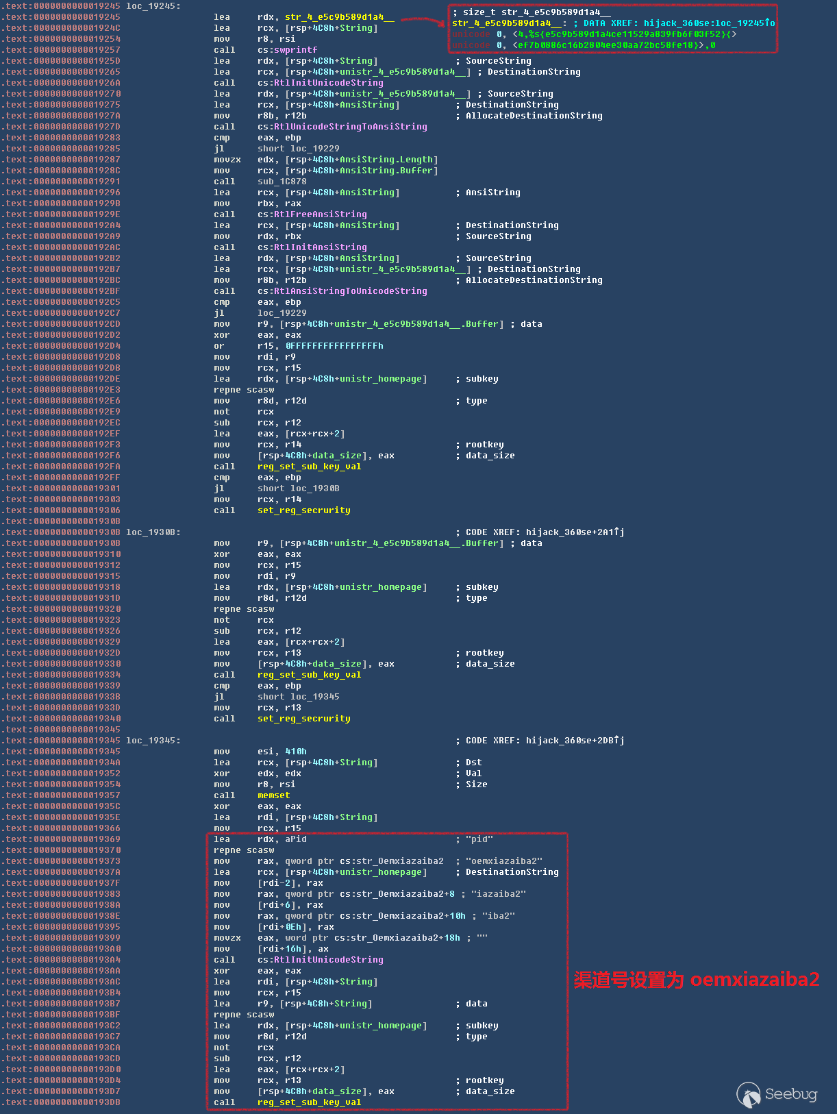 最引起我們注意的是,在劫持360安全瀏覽器首頁的同時,病毒還將渠道號設置成了 "oemxiazaiba2",字母組成的后半部分為"下載吧"全拼,但由于可以獲取到的信息十分有限,我們暫時無法求證其與"下載吧"是否存在直接關系。如下圖所示: