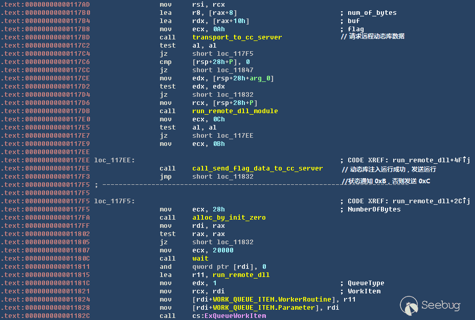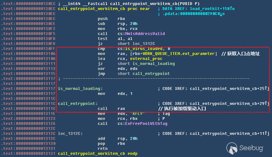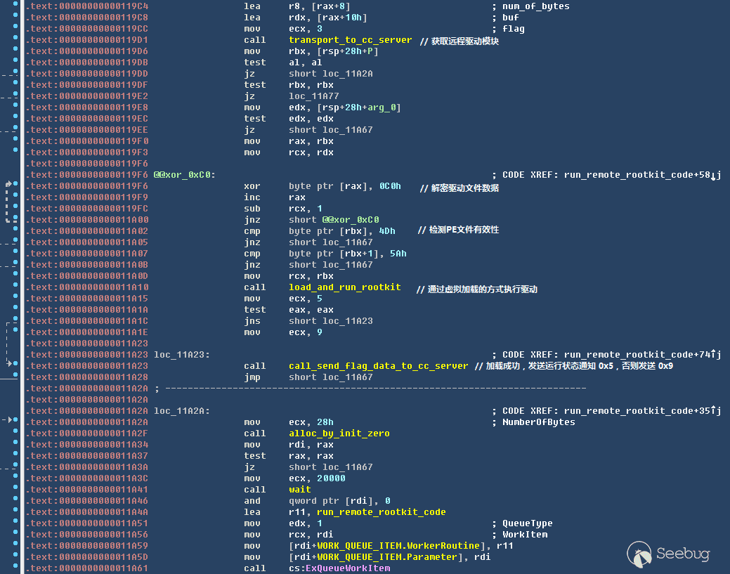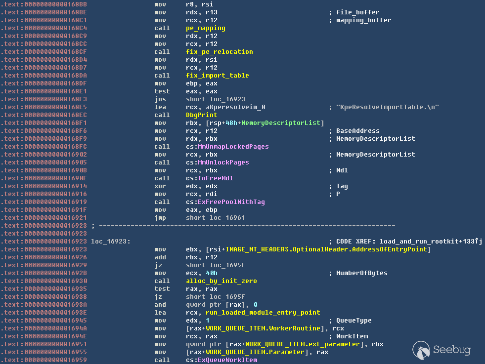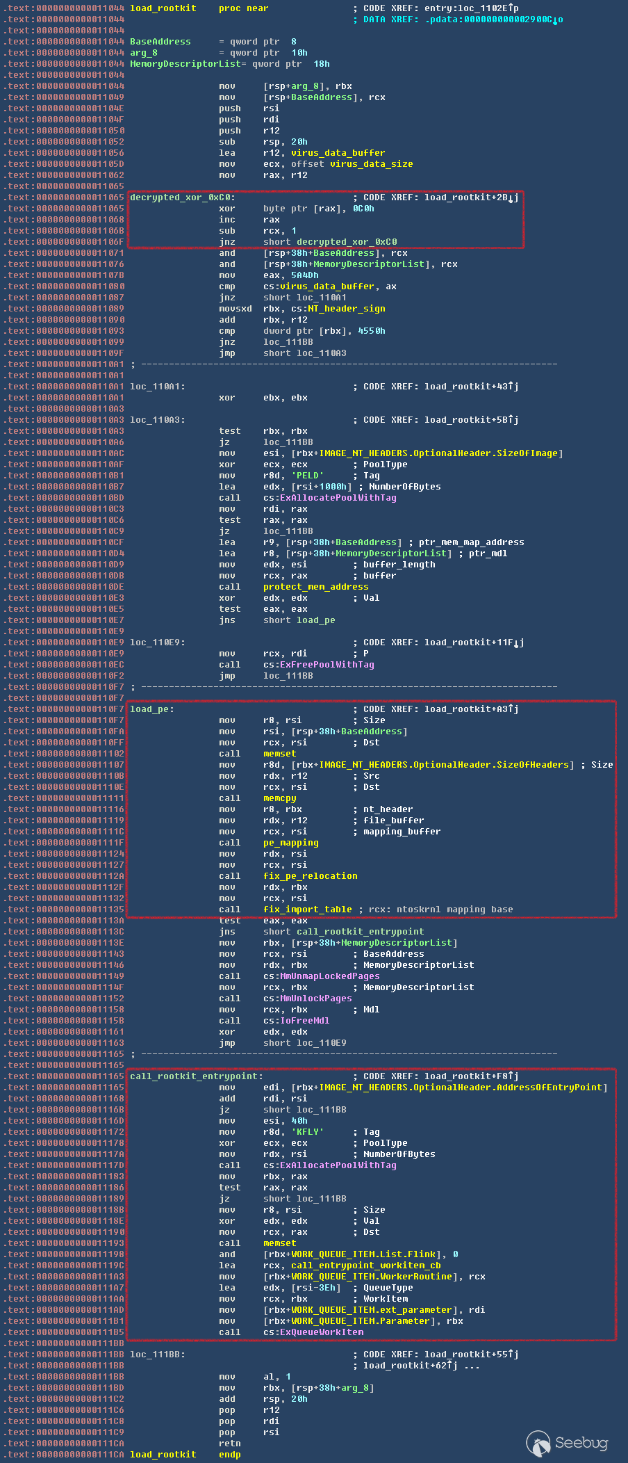 load_rootkit 函數會通過與虛擬映射 ntoskrnl 相同的方法加載真正的病毒驅動。病毒驅動的鏡像數據是被異或 0xC0 加密過的,該函數首先會將病毒數據進行解密,之后對該驅動進行映射并修復導入表和重定位數據,最后通過調用 ExQueueWorkItem 函數執行病毒驅動入口。如下圖所示: