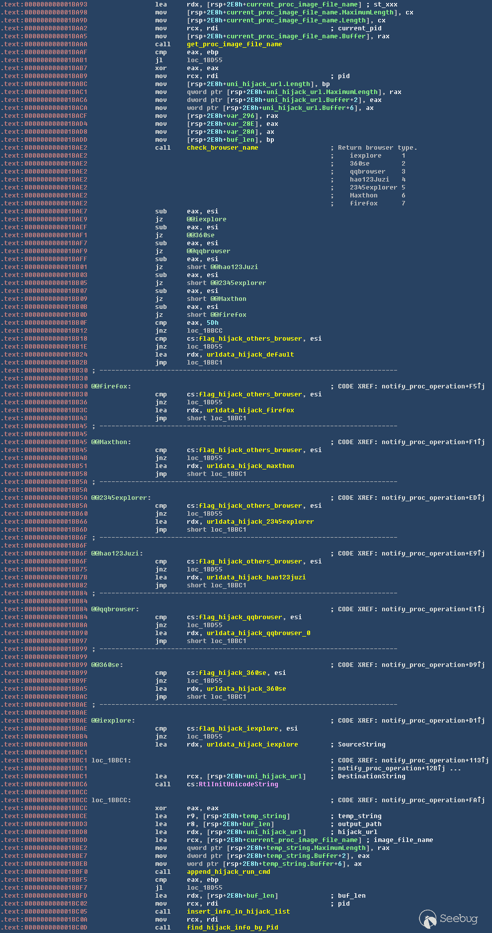 除了上述介紹的病毒所使用的劫持方法外,病毒還通過注冊進程回調和映像加載回調劫持瀏覽器啟動參數進行流量劫持。如下圖所示: