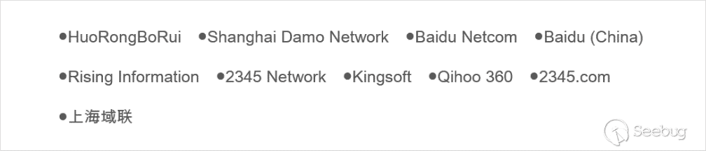 在判斷正在加載的映像是否屬于黑名單時,病毒先常見的內核級流量劫持病毒的文件名進行匹配,如果文件名中包含 Mslmedia.sys 或者 mssafel.sys 則會禁止其執行。之后,病毒會獲取當前映像的簽名信息與黑名單中的簽名信息進行匹配,如果包含則也會禁止其執行。黑名單中的簽名信息包括:火絨、360、金山、2345、瑞星、百度,甚至還包括 ADSafe 的簽名和病毒常用"上海域聯"簽名信息,但是其中依然沒有騰訊電腦管家相關簽名信息,由此我們可以推斷病毒對騰訊電腦管家是有意進行放過的,并非無意之舉。簽名信息黑名單信息,如下圖所示:
