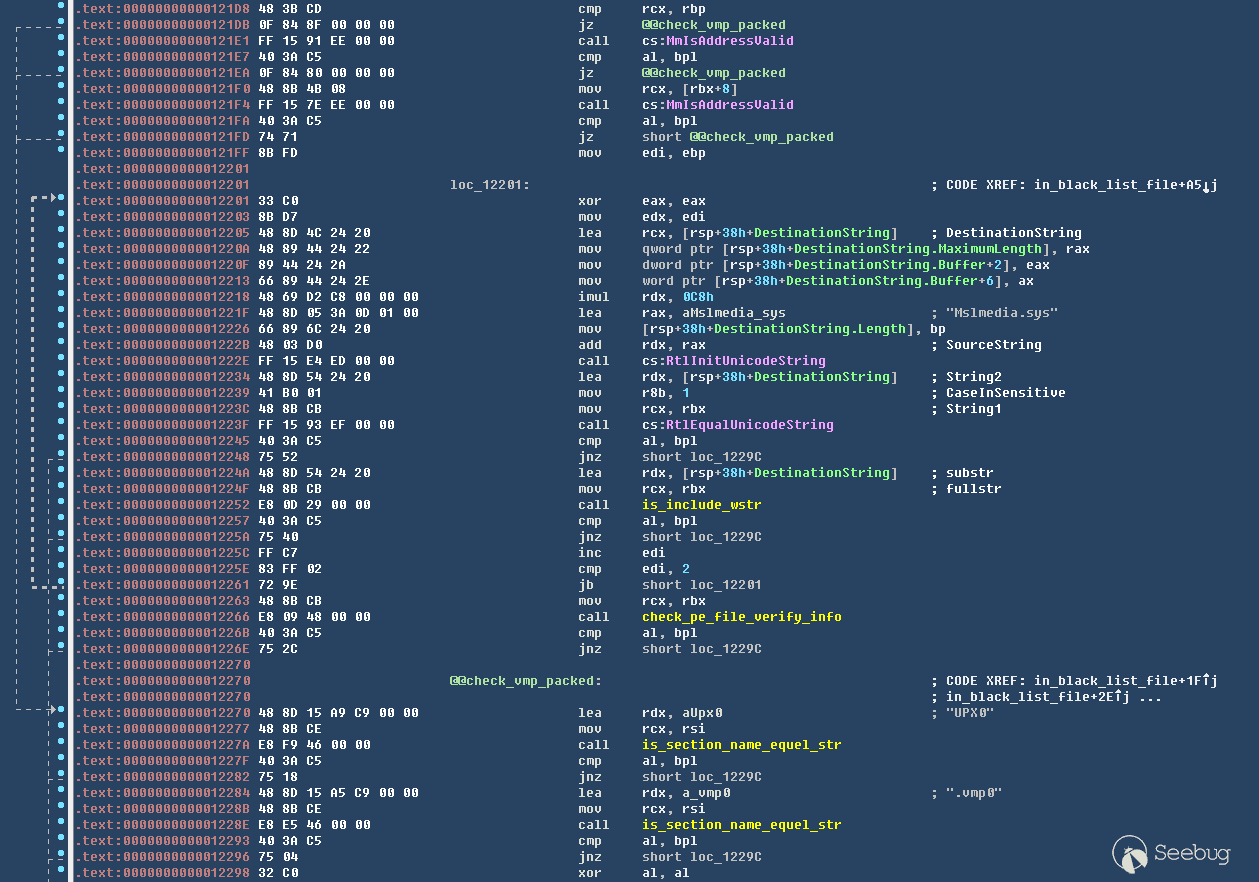 由于很多內核級流量劫持類病毒都使用 VMProtect 殼進行保護,所以病毒作者還加入了一個更加暴力的判斷方法,如果節名為 UPX0 或者 .vmp0 則禁止驅動邏輯執行。如下圖所示: